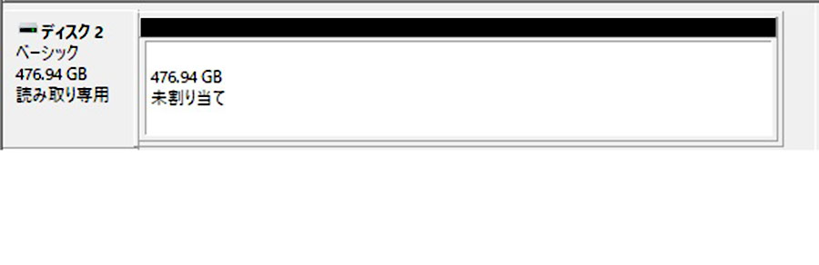 ディスクの管理で確認すると、領域は全くなく未割り当ての状態でした。