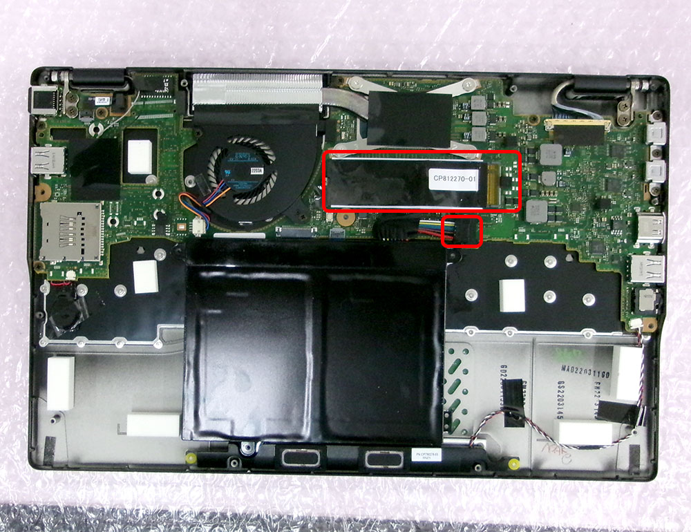 バッテリーコネクターを抜いてから、SSDを取り外します。