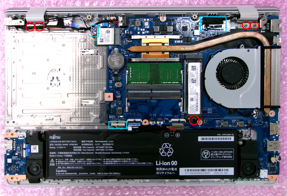 液晶とWi-Fiのケーブルを基板から抜き、ヒンジ部固定のネジを4個外して上下を切り離します。