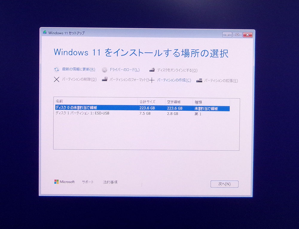 USBメモリーのインストーラからWindows11をインストールしていきます。