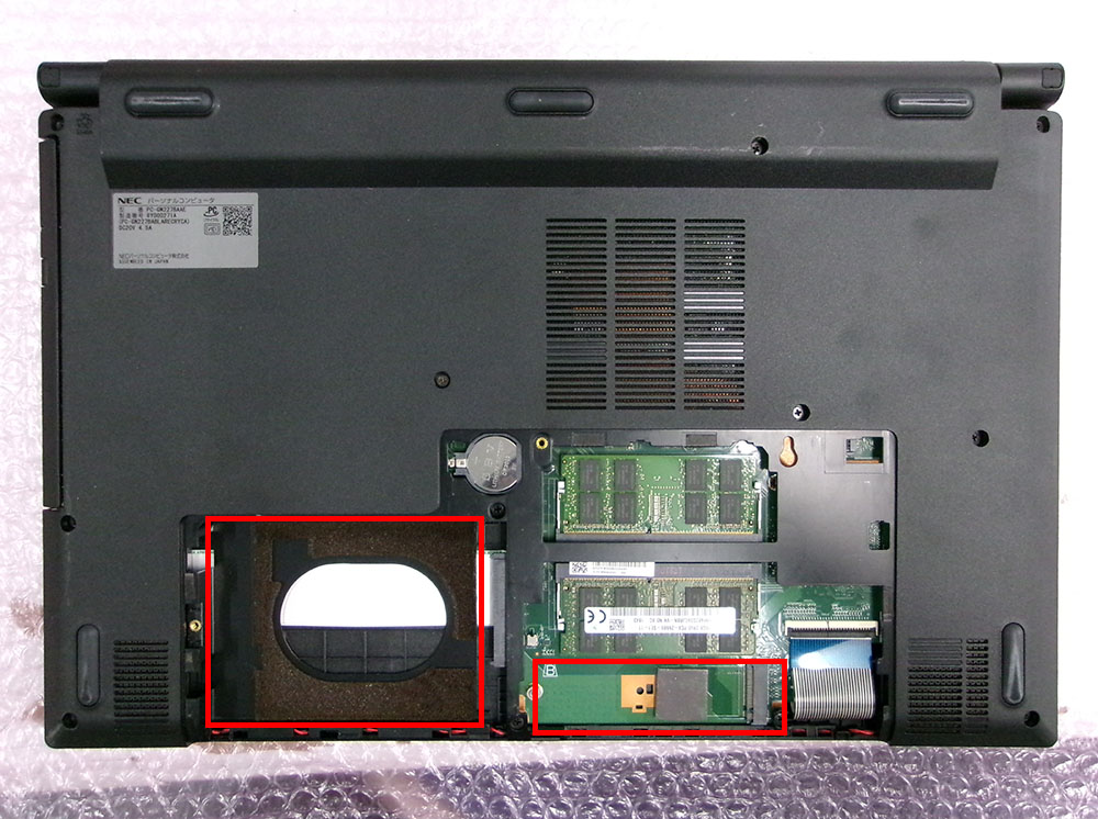 SSD・HDDを取り外した後の写真しかありませんでしたが、赤枠の位置にM.2 SSDと2.5インチHDDがありました。