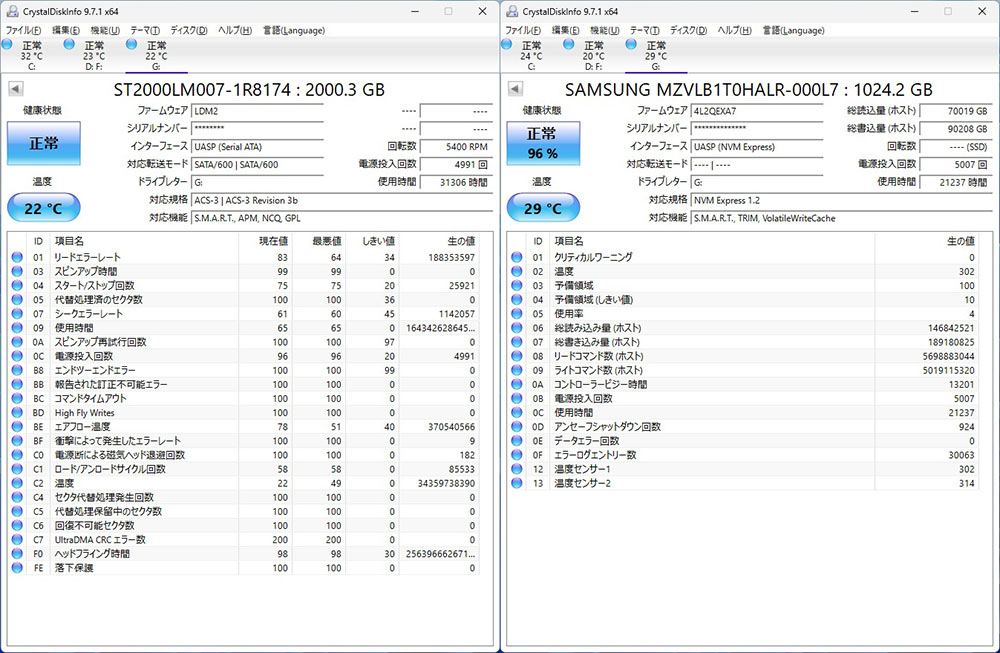どちらも2万時間を超えているので交換時期ではありますが、読み出しスピードテストでも大きな問題はありませんでした。