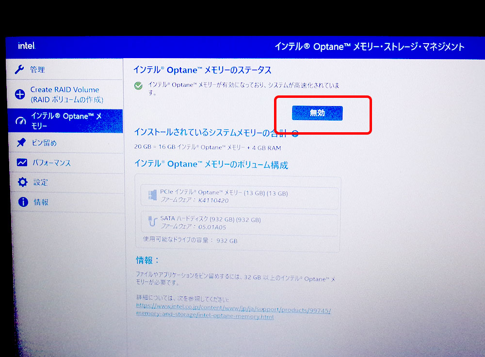 このパソコンはOptaneメモリーと1T HDDを組み合わせて高速化を図っています。