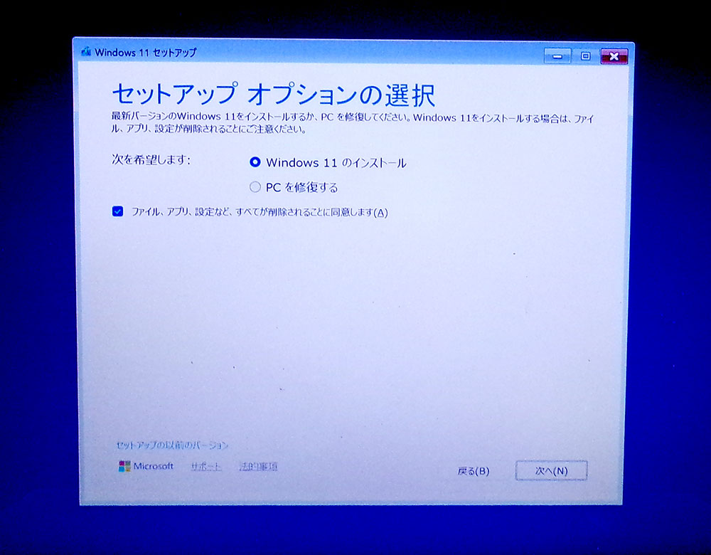 今回はデータは消えても問題なしですので、Windows11をクリーンインストールします。