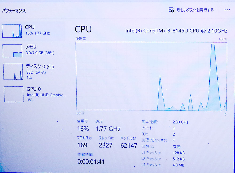 動作が遅いということなので、タスクマネージャーのパフォーマンスを確認しました。